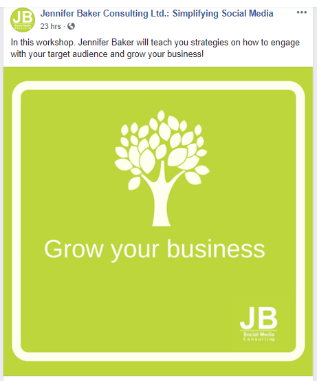 Now that you’ve captured an audience of people who are interested in your event or are planning to attend. Treat it like a social media page for your business. Regular posting means regular engagement. Regular engagement then leads to commitment to your event. You can post event updates, behind-the-scenes photos, Facebook Live videos and anything else that you think might be of interest to your audience. In the case of Jennifer Baker Consulting Ltd.’s upcoming workshop, we’ve decided to post the top 10 reasons to attend our event. Here’s an example.