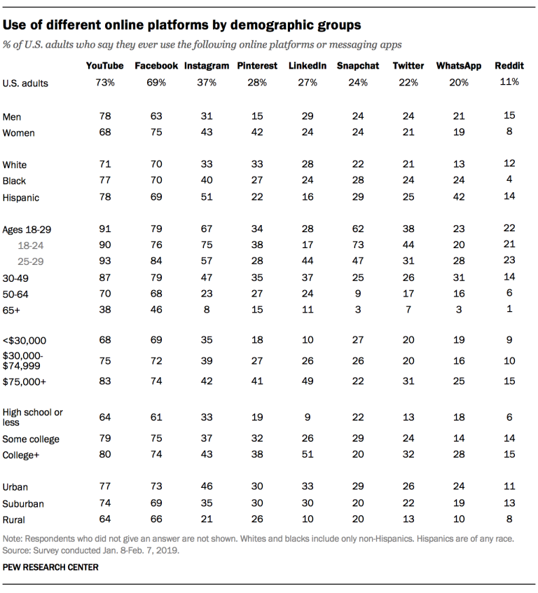 In addition, each social media channel is visited by a unique population. Pew Research has prepared some in-depth research on this topic, including the below demographic analysis: