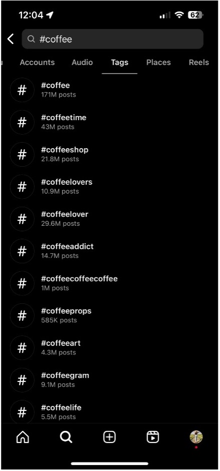 Once you know your objectives, it’s time to choose the right hashtags. Avoid the overly popular ones like #coffee at the top of the search results, as they might lead to your content getting lost. Instead, scroll down to find more niche and targeted hashtags that resonate with your audience.
